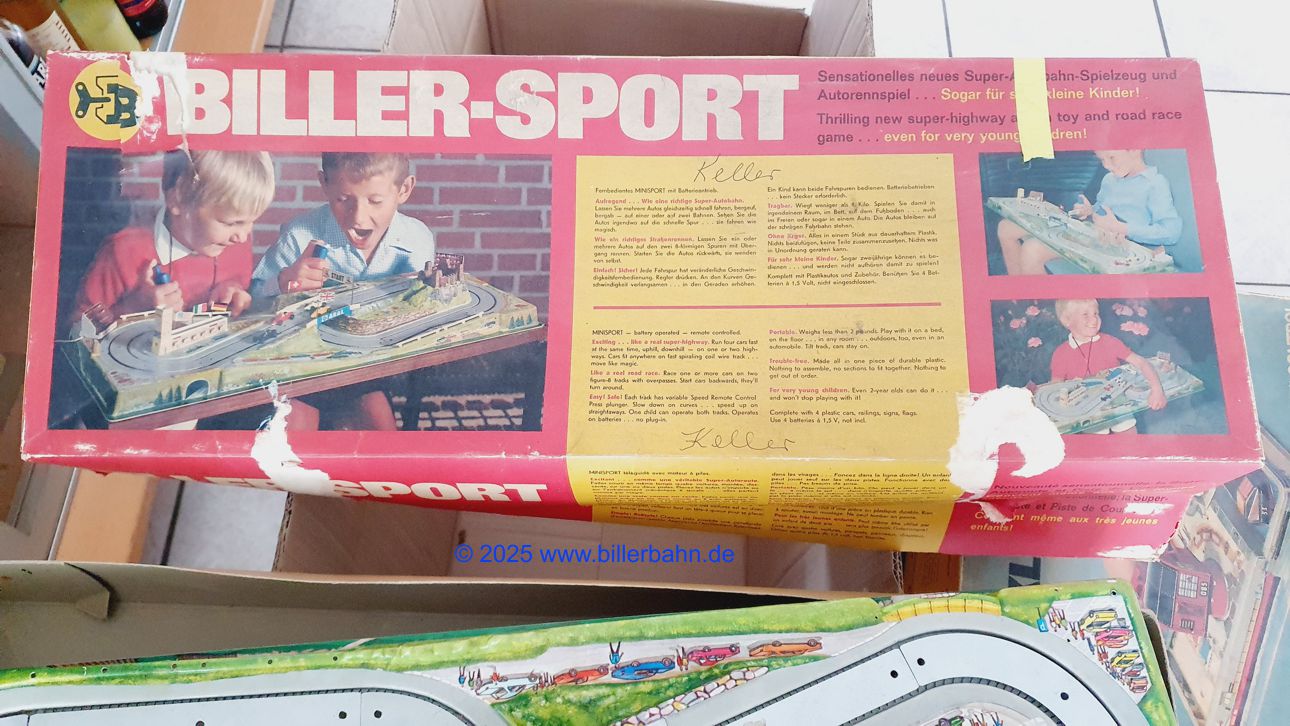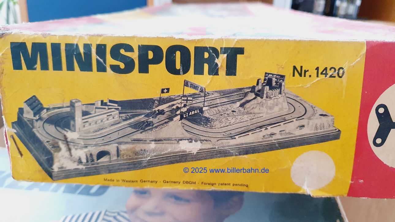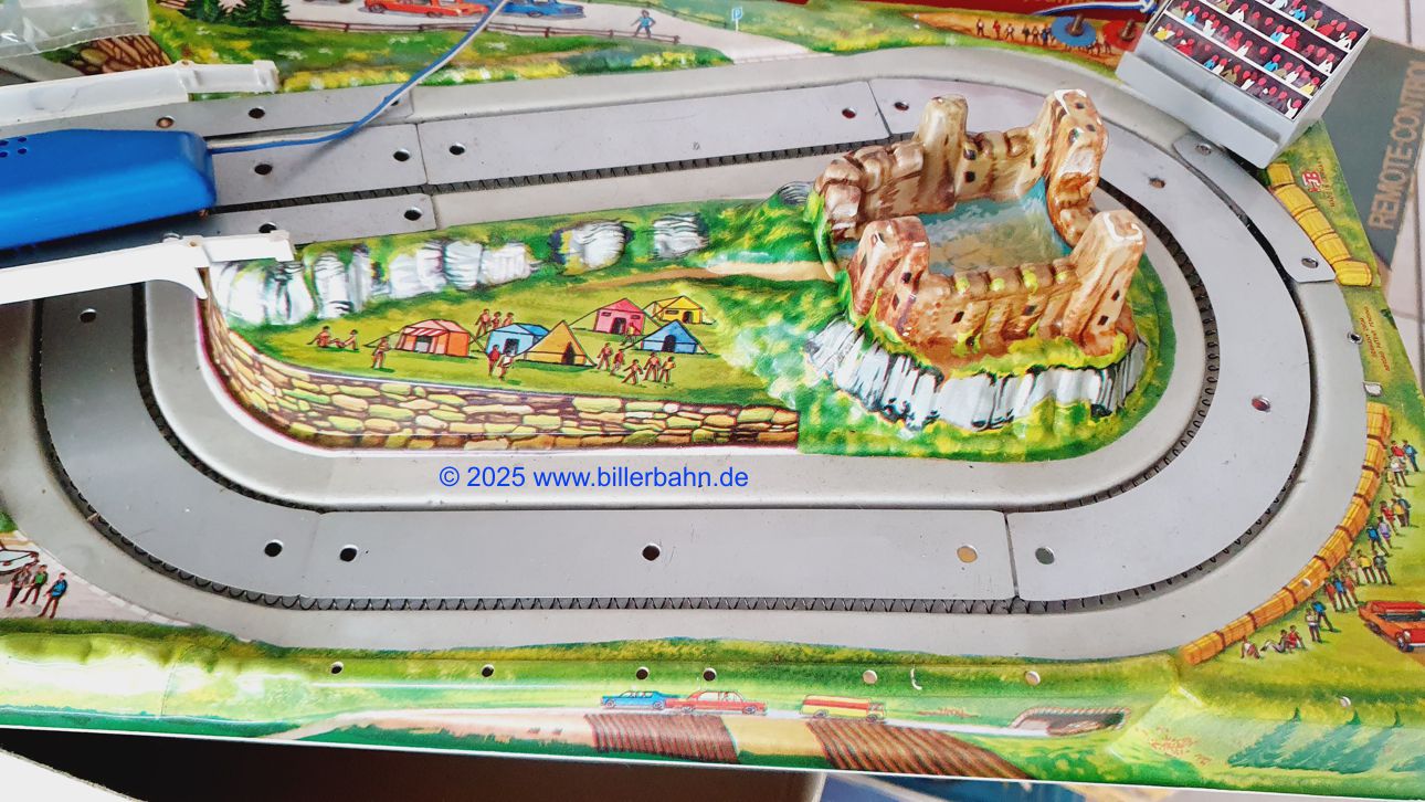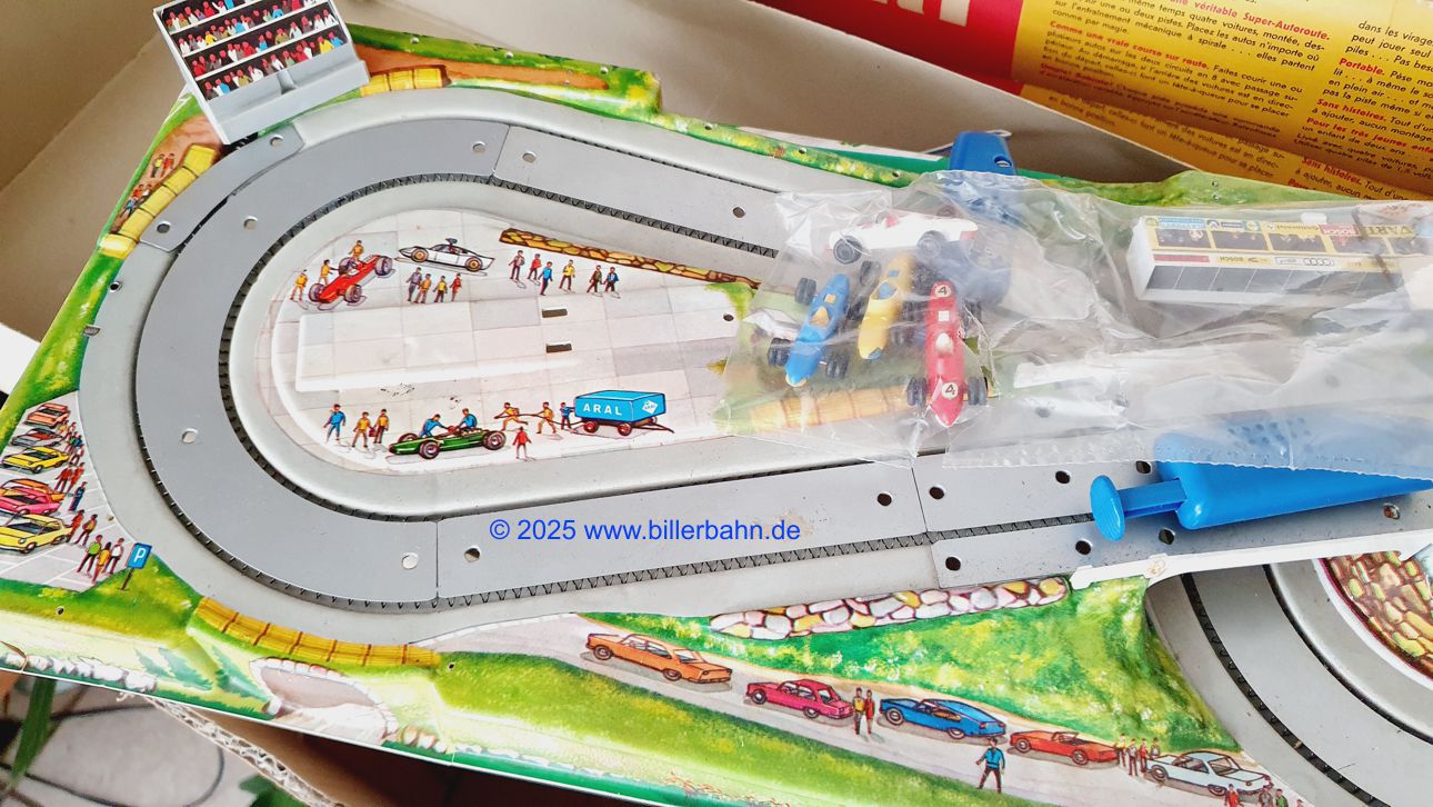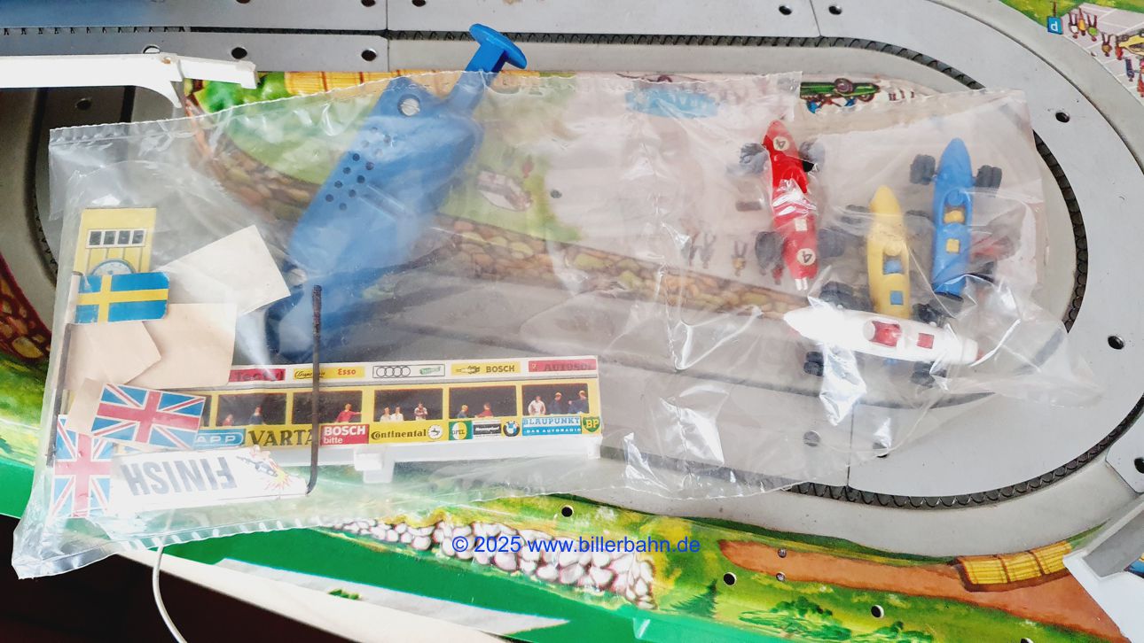 nahezu komplett - es fehlt 1 Fahnenmast - im deutlich lädierten OKT. In der Plastiktüte befinden sich 4 komplette Autos. Weiterhin sind in dem Tütchen die steckbare Boxengasse, die leicht lädierte Start-Ziel-Flagge, ein Kupfermast mit schwedischer Flagge und jeweils 2 einzelne Papierflaggen FR, GB und CH - und 1 x ARAL und 1 x Continental Werbung.  Blaue Regler - an der Tiefziehfolie kleinen Riss (Bild 5) - die Fahrbahn hier und da leicht wellig. Die Anlage funktioniert natürlich - ist getestet.