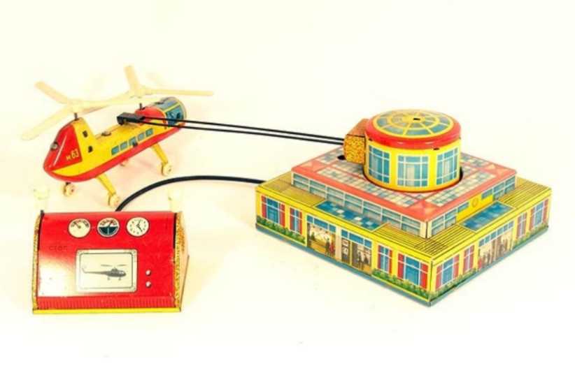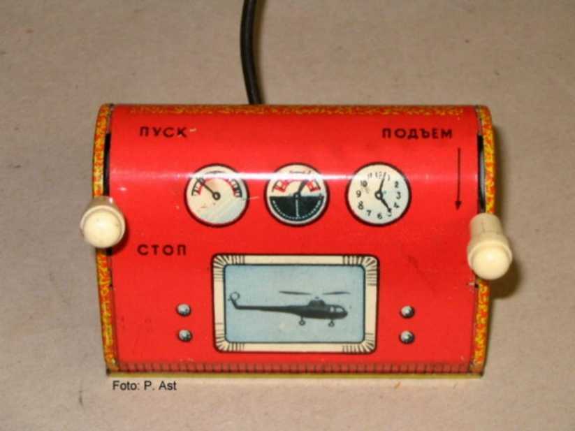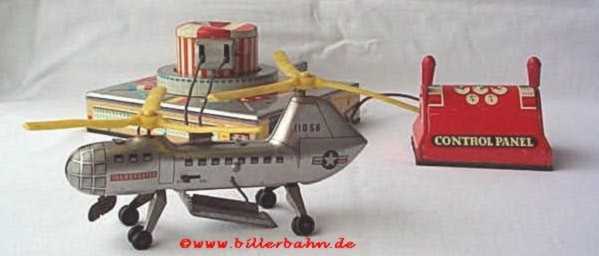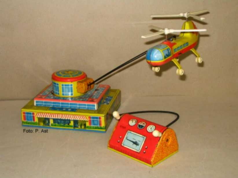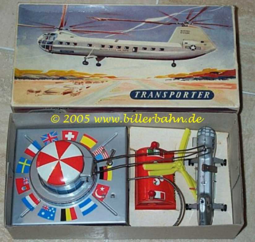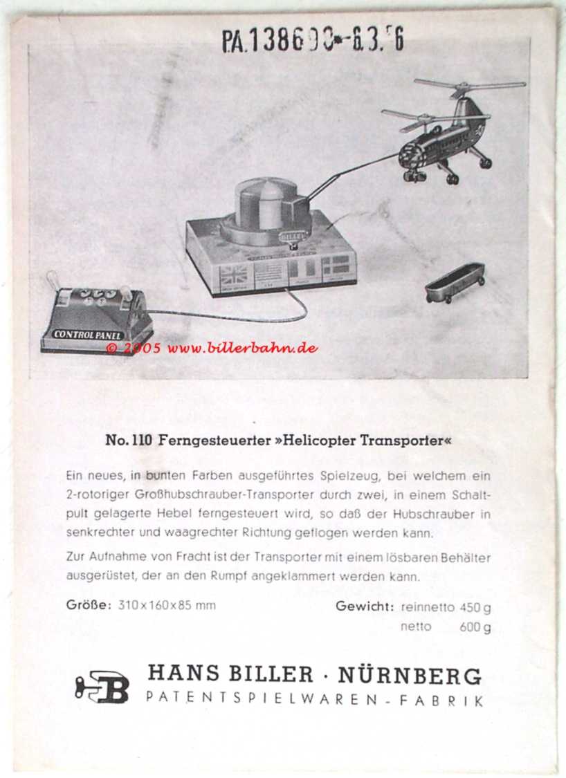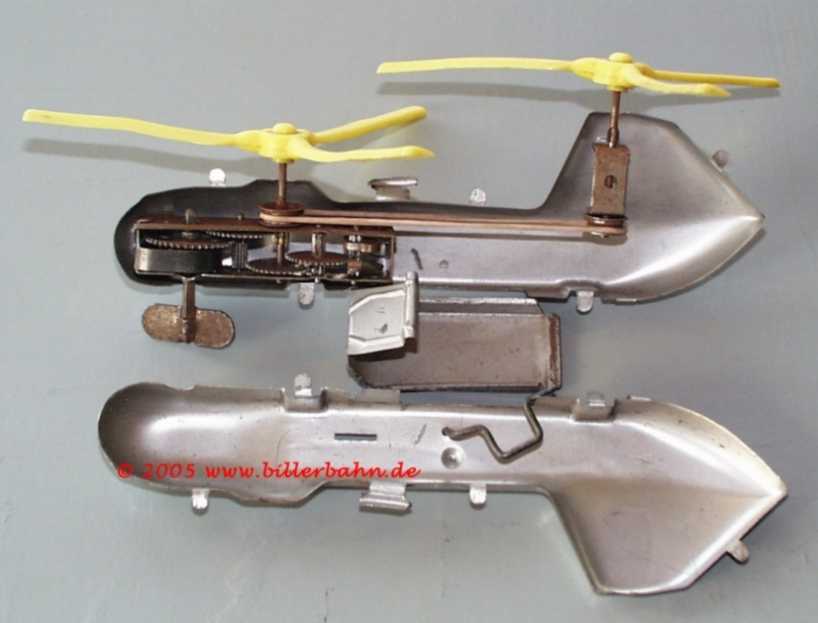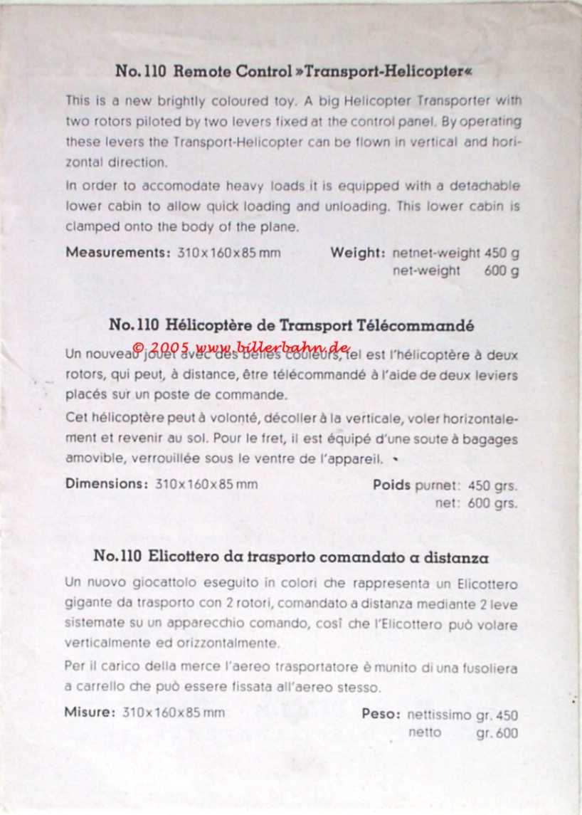 lithographed, boxed. Appeared in the 1959 price list as 115 - must have been available earlier. The number P.A. 138 690 and the date 06.03.1956 stamped on the 1st leaflet can not be confirmed according to my documents. Possibly NO patent was issued for this toy because it was mainly the same as the Trans World Flyer - and the TWF received a patent (see at the 100 TWF). This would explain why the 1st version of this helicopter toy was presented and delivered with the base station of the TWF. 110 Novelty 1956 - available until ??? 115 Novelty 1958 ??? - available until 1965 Seize: 310 x 160 x 85 mm |
