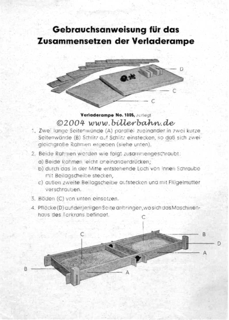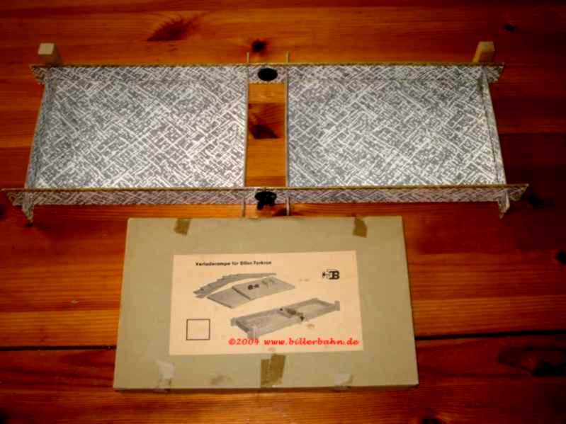offered from 1963 for self-assembly. The complete layout is made of card board paper. See the instruction for assembly details. This ramp could be used for the giants 1800 E and 1816. Seize: assembled 480 x 180 x 45 mm - the box 247 x 153 x 15 mm - Novelty 1962 |
