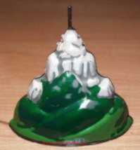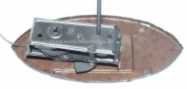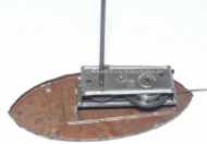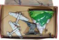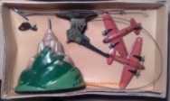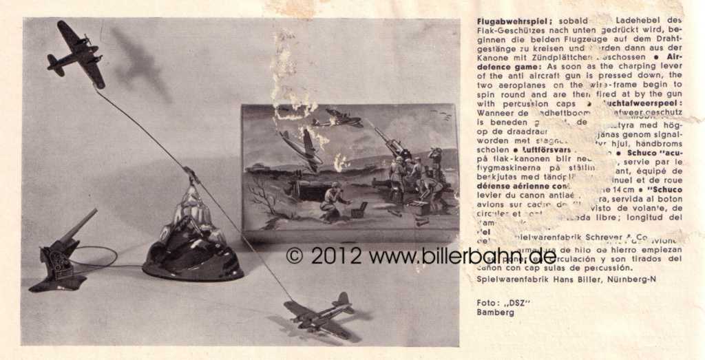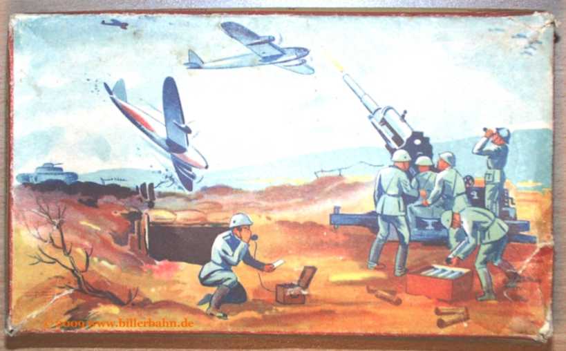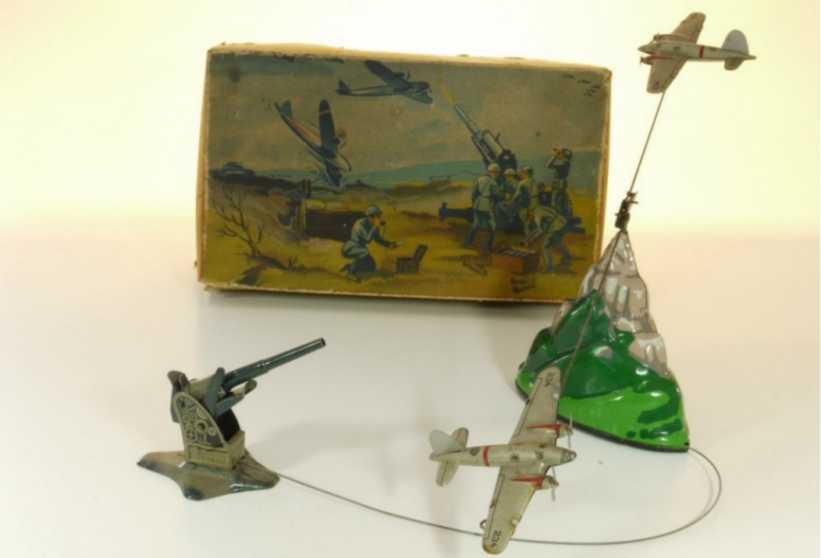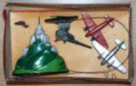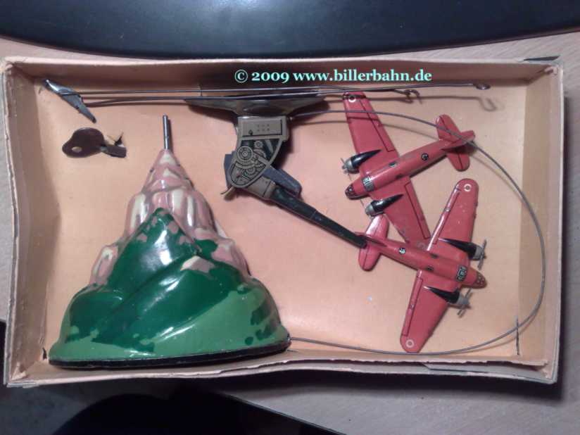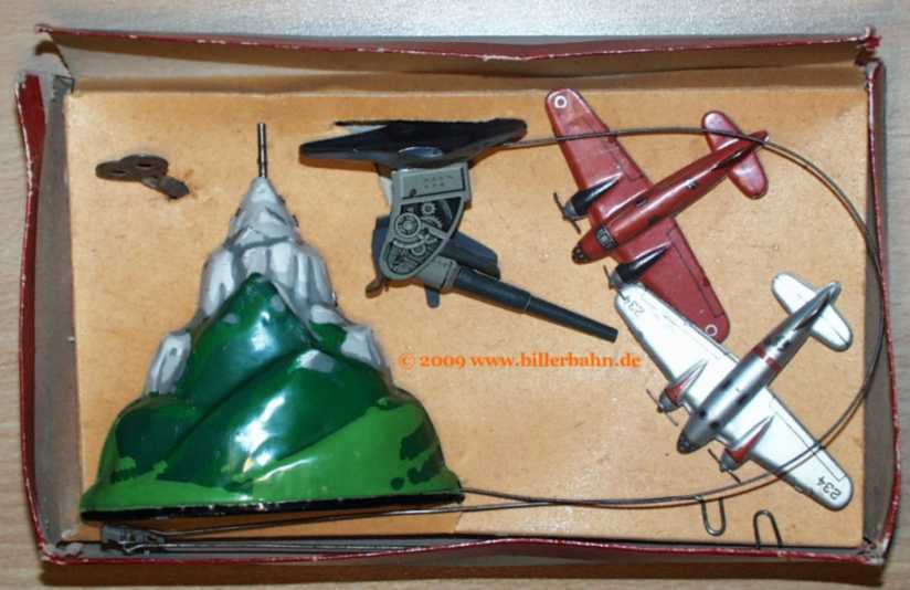 patented this game on the Aug 11, 1938 and Mar 16, 1939. This is the first toy with Bühler clockwork - earlier toys have a Georg Grötsch (GGN) clockwork. Two aircraft are attached to unequal length poles which revolve on a clockwork mechanism contained in the mountain. When the clockwork mechanism is wound up and released, centrifugal force enables the planes to fly at the same altitude even though the poles are unequal in length. When the AA-gun is "fired" the clockwork mechanism stops, and the plane on the longer pole appears to be "shot down", because it is pulled down by gravity. The description was presented in 5 steps on the sides of the box. Neither the box nor the game itself show any indication of the maker - just the word "foreign" is imprinted on one side of the box. |