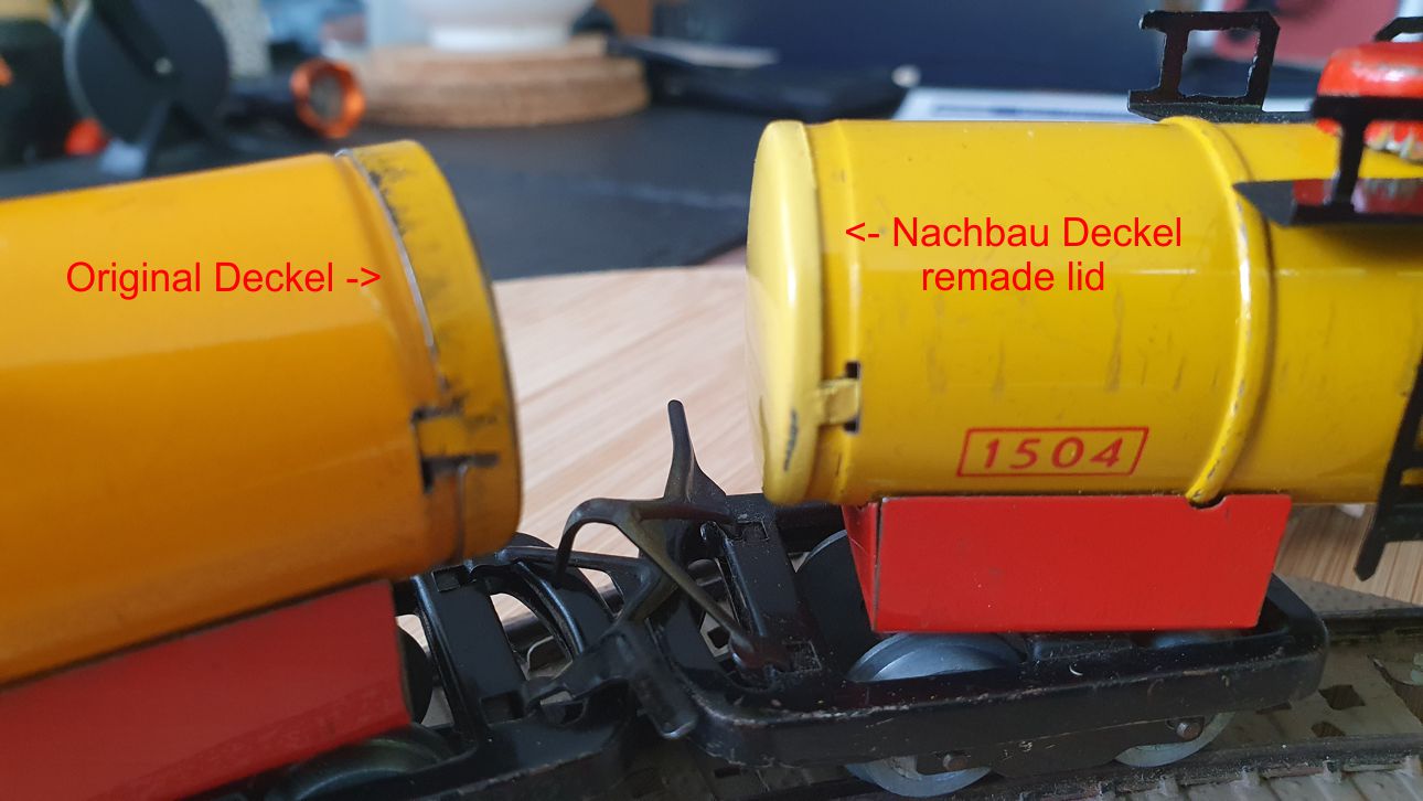 | See a battery tanker in unique dark yellow - but the filling hoods are different lithographed in RAL 3003 ruby red (left) and RAL 3000 fire red. This hodge-podge is also expected at the tank supports - and at the 513 "normal" tanker. We will see. | in order to reduce the weight of the 1504 battery truck: inserted - by a 3D-printer made - plastic dummies to allow an operation with 3 x AA-Batteries. |