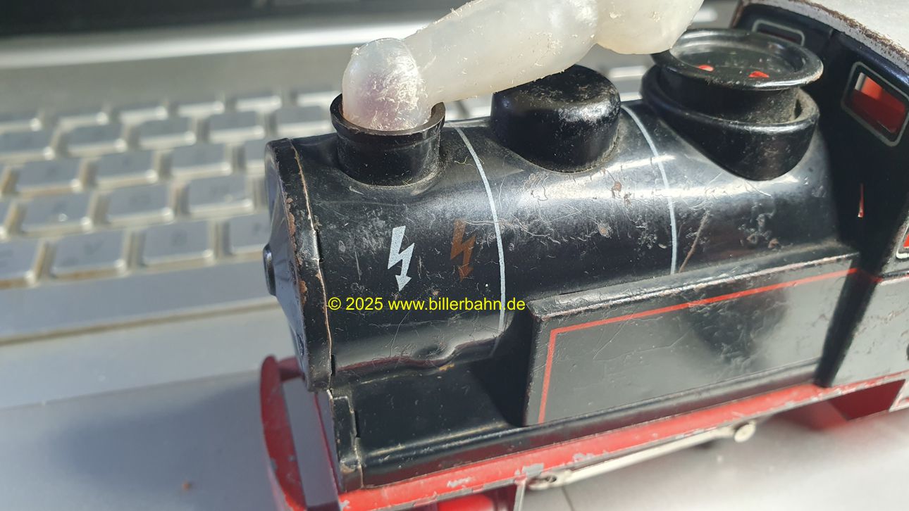 | same as the 1500 E, now having a small red bulb inside the more flat chimney. The plastic smoke makes it appear a real smoking loco. Novelty in 1959 - available until at least 1961. There are at least 2 locos known to have hand-painted coal-boxes. Biller simply used the green coal box of the 500 and painted them black. | It took a really long time - but a team from Switzerland and Germany managed to get a factory convinced to reproduce 20 pieces of the smoke for the 1510 Steam loco. In this case again the well known Swiss Precision was proved. Really well done - thanks a lot to all parties. | ||