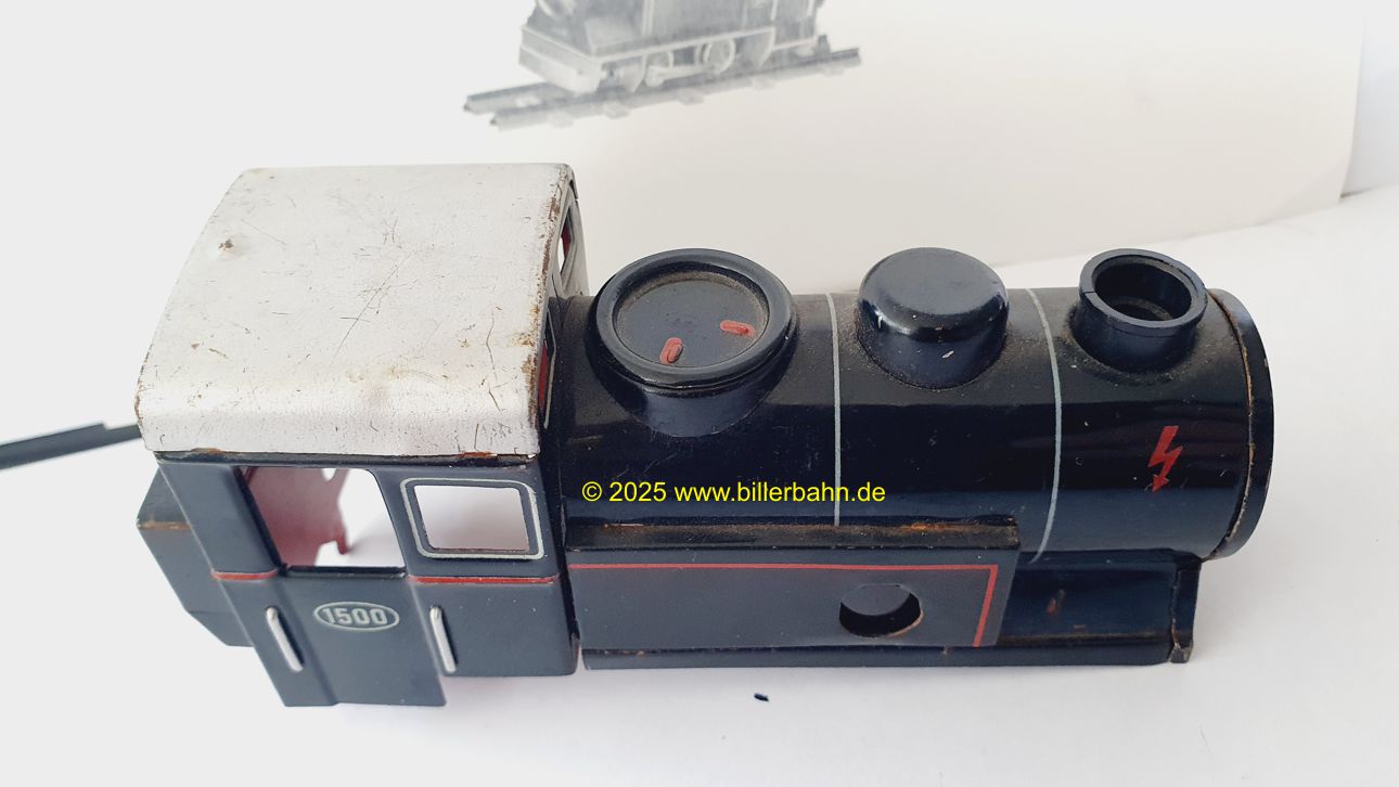 | Black superstructure, silver roof, red chassis and engine cover. Flat black switch. "1500" imprinted on both doors, a flash each side underneath the chimney. And the corresponding tender 1502. Novelty in 1956. By the way - all my 1500 have straight piston rods. | retailers journal "Das Spielzeug" - FEB 1956 - adverts Billerbahn as "now also electrical" | ||